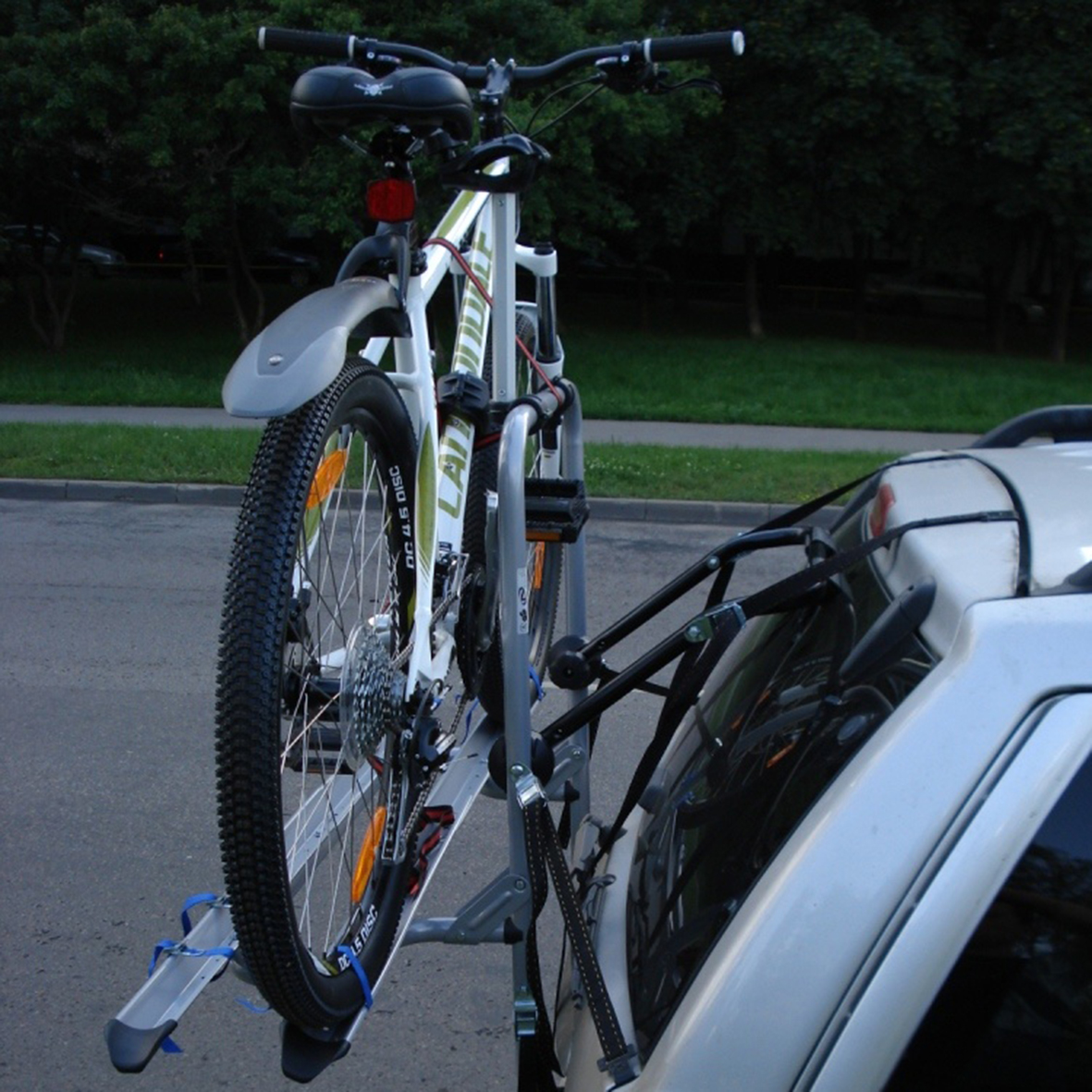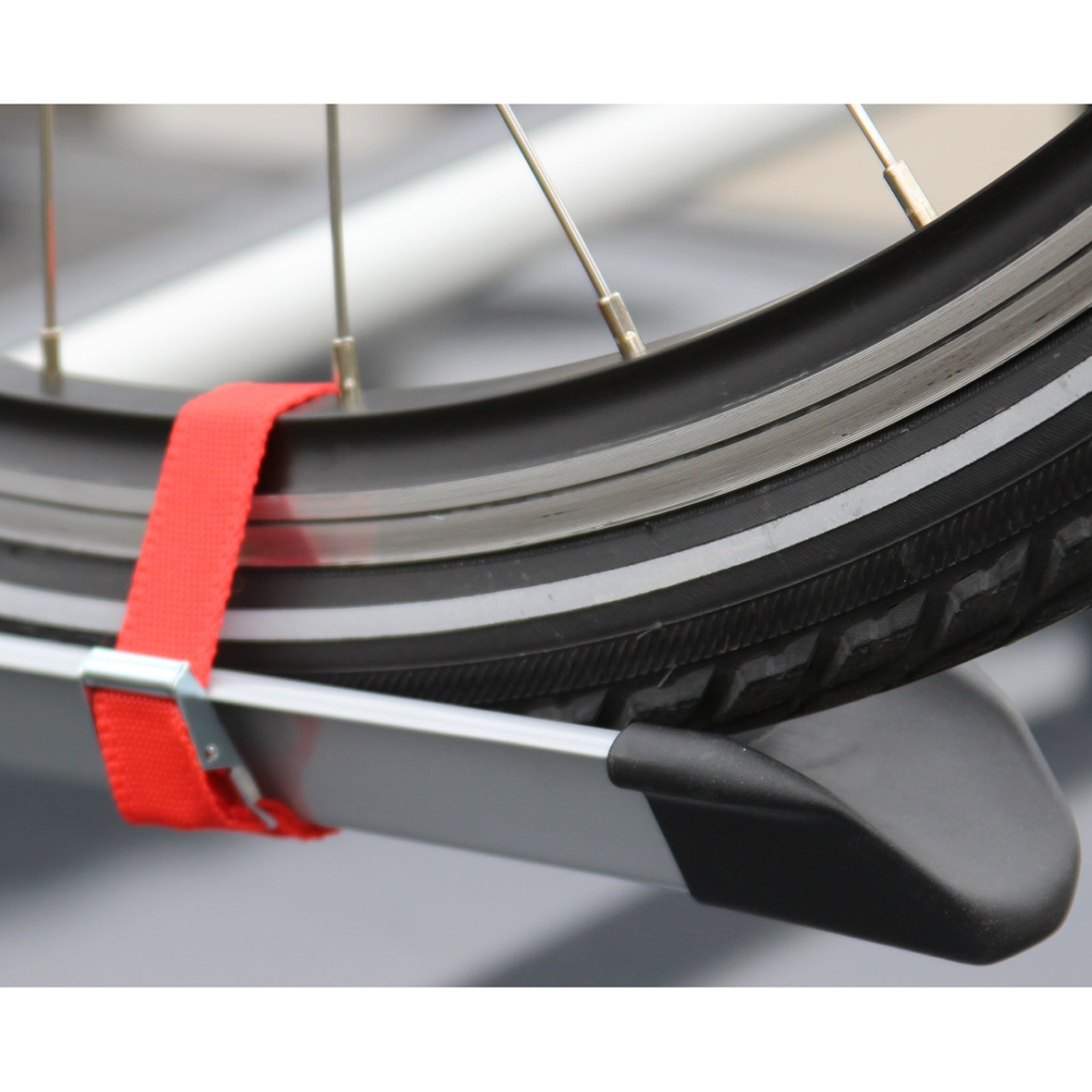 Στο πάνω μέρος έχει 2 ρυθμιζόμενα μπράτσα με ροδέλες για τέλεια προσαρμογή επάνω στο σκελετό των ποδηλάτων, συγκρατώντας τα σταθερά κατά τη μεταφορά ενώ παρέχεται και η δυνατότητα χρήσης πρόσθετης κλειδαριάς (δεν περιλαμβάνεται – πωλείται ξεχωριστά) στο κάθε ένα από αυτά και στο κάτω μέρος οι ράγες (βέργες) συγκράτησης των ελαστικών διαθέτουν στα άκρα τους από 2 ιμάντες δέσης (λουριά) για να συγκρατούν με απόλυτη ασφάλεια και σταθερότητα τους τροχούς των ποδηλάτων.