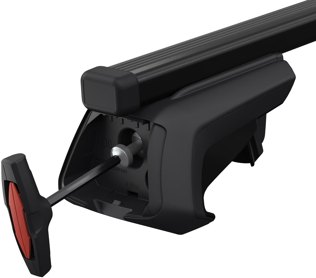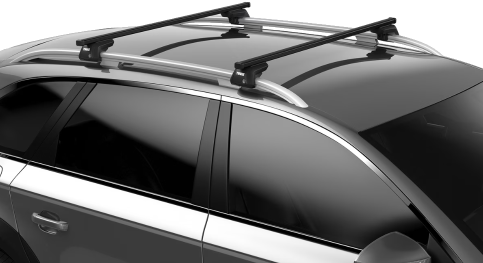 Complete universal raised railing rack including feet, a locking mechanism and Thule SquareBars.