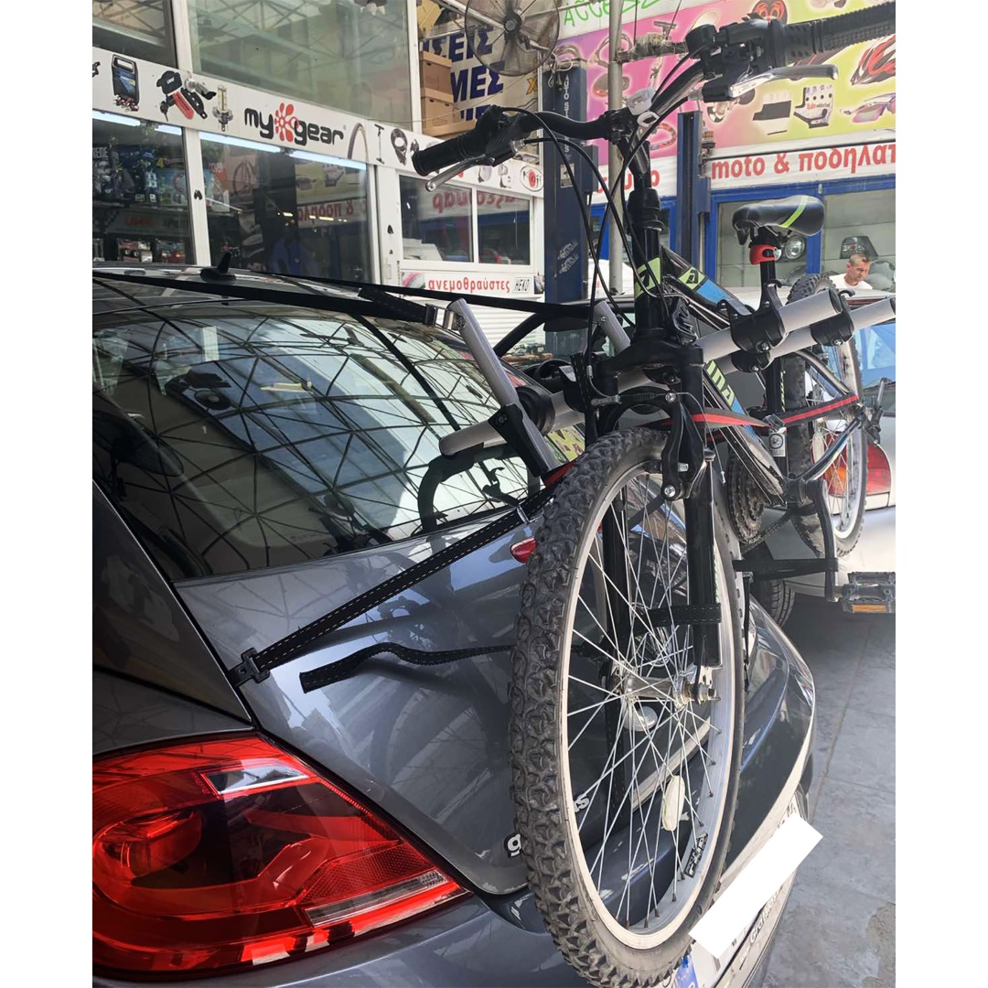 ΒΑΣΗ ΠΟΔΗΛΑΤΟΥ ΠΟΡΤ ΜΠΑΓΚΑΖ FOLLOW ME T3 ΓΙΑ 3 ΠΟΔΗΛΑΤΑ NORDRIVE Ασφαλής και αξιόπιστη βάση στήριξης και μεταφοράς Follow Me Τ3 έως 3 ποδήλατα, κατάλληλη για τοποθέτηση στο πορτ παγκάζ του αυτοκινήτου σας. Κατασκευασμένη από υψηλής ποιότητας και αντοχής υλικά, ιταλικής προέλευσης από την εταιρία Nordrive. Διαθέτει μεταλλικούς σωλήνες με διάμετρο 25 mm και ενσωματωμένες δέστρες ποδηλάτων (υποδοχές για την απευθείας δέση των σκελετών πάνω στην βάση, χωρίς την χρήση επιπλέον ιμαντα). Επιπρόσθετα, παρέχονται συνδέσεις με πλαστική επικάλυψη για την αποφυγή γρατζουνιών και εξαιρετικά ανθεκτικούς, ρυθμιζόμενους νάιλον προσαρμογείς για τη καλύτερη τοποθέτηση στο πορτ μπαγκάζ του οχήματος. Όλα τα σημεία της βάσης ποδηλάτου Follow Me Τ3 που έρχονται σε επαφή με το αμάξωμα του οχήματος είναι πλαστικοποιημένα με επένδυση από καουτσούκ για να προστατεύουν το όχημά σας από φθορές και γδαρσίματα. Κατάλληλη για τα περισσότερα ποδήλατα με τριγωνικό πλαίσιο. Γρήγορη και εύκολη συναρμολόγηση. Ιδανική για όλα τα πορτ παγκάζ των αυτοκινήτων (3d/4d (sedan)/ 5d (ΗΤΒ)). - Διάμετρος σωληνών: 25 mm. - Υλικό : Ατσάλι. - Χρώμα: Ασημί. - Μέγιστο βάρος φορτίου : 45 kg. - Χωρητικότητα: 3 ποδήλατα. - Περιλαμβάνει: 6 δέστρες, νάιλον προσαρμογείς (ιμάντες) για τοποθέτηση. ΣΗΜΕΙΩΣΗ: Τα μεταφερόμενα ποδήλατα δεν πρέπει να παρεμποδίζουν την ορατότητα των πινακίδων κυκλοφορίας ή των φώτων, ακόμη και μερικώς. Δείτε επίσης: ΟΔΗΓΙΕΣ ΧΡΗΣΗΣ/ΣΥΝΑΡΜΟΛΟΓΗΣΗΣ