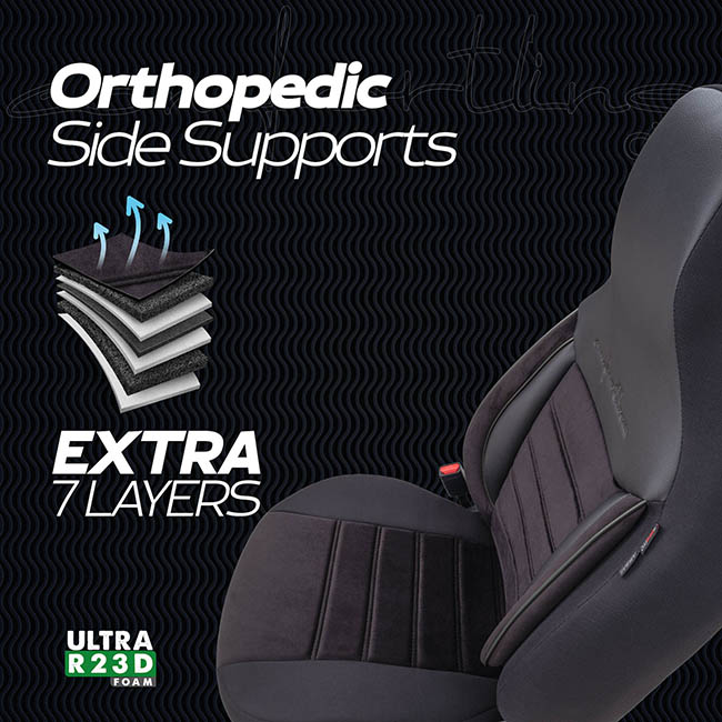 Extra Supportive 7 Layers: Ορθοπεδικός σχεδιασμός 7 στρώσεων στα πλαϊνά ώστε να παρέχεται στήριξη στην πλάτη και τη μέση. Προλαμβάνει τον πόνο και αυξάνει την οδηγική άνεση.