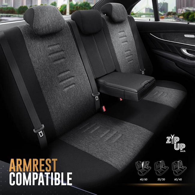 Zip-up Tech: Διαθέτει 3 φερμουάρ ώστε να προσαρμόζεται στα πίσω καθίσματα είτε είναι διαιρούμενα 60-40, είτε 40-60, είτε 50-50.