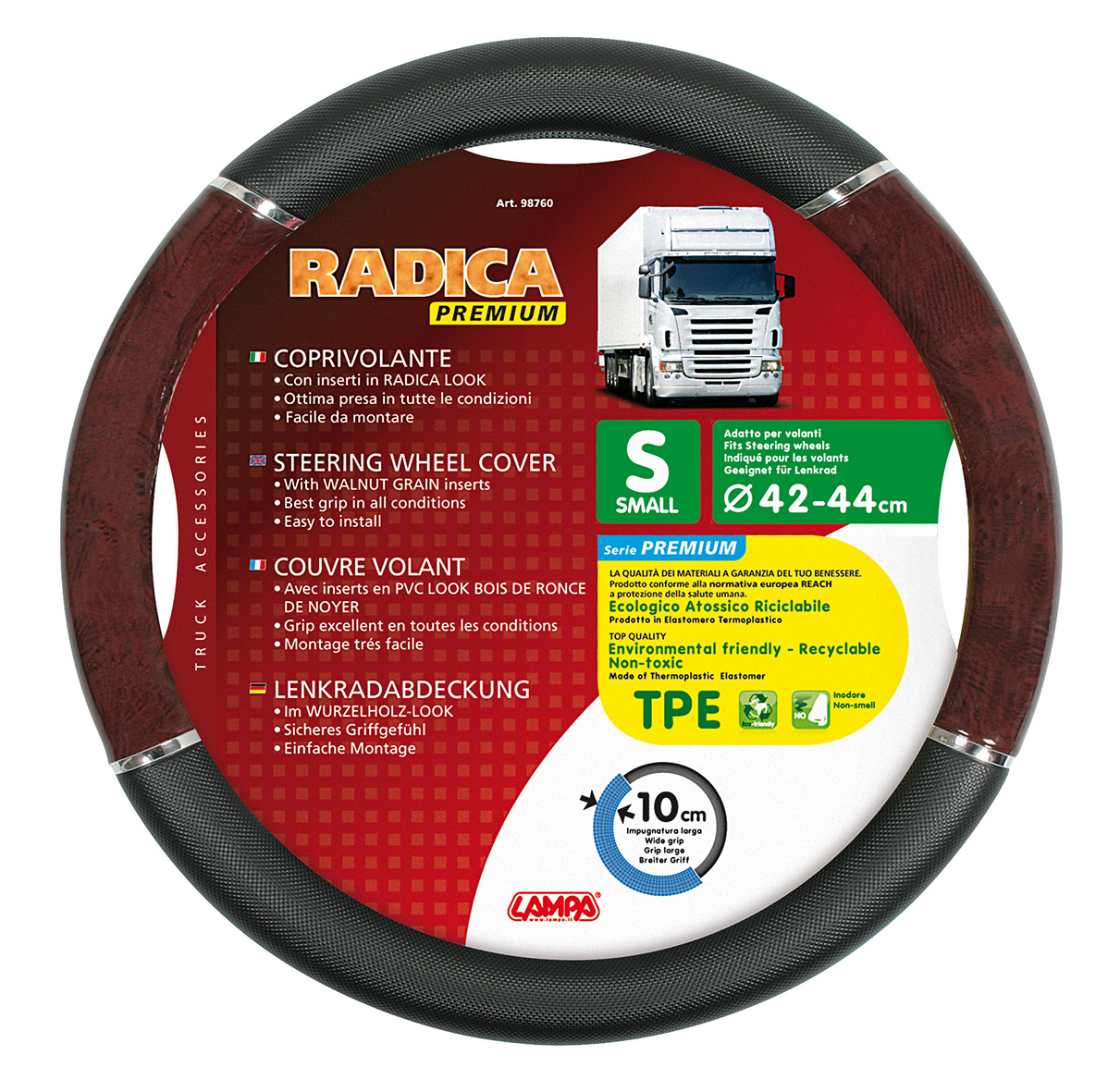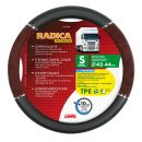 ΚΑΛΥΜΜΑ ΤΙΜΟΝΙΟΥ ΦΟΡΤΗΓΟΥ RADICA (S) 42-44cm (ΜΑΥΡΟ/ΞΥΛΟ/ΟΙΚΟΛΟΓΙΚΟ/ΑΟΣΜΟ) Κάλυμμα τιμονιού RADICA της Lampa από τη σειρά TPE Premium, ιταλικής κατασκευής, σε Small μέγεθος κι εξωτερική διάμετρο 42>44 cm, κατάλληλο για χρήση σε φορτηγά. Η κατασκευή του αποτελείται από θερμοπλαστικό ελαστομερές TPE (καουτσούκ) και ξύλο από κόκκους καρυδιάς, η οποία το καθιστά πλήρως φιλικό προς το περιβάλλον (οικολογικό), μη τοξικό, άοσμο και ανακυκλώσιμο. Είναι αντιολισθητικό με ευρεία λαβή 10 cm, εξαιρετική αίσθηση στην αφή και άνετο κατά την οδήγηση. Προστατεύει το τιμόνι του οχήματος από φθορές, ξέβαμμα, σκόνη και ιδρώτα, ειδικά κατά τις πολύωρες και μακρινές διαδρομές. Ιδανικό και για επαγγελματική χρήση. - Διαστάσεις: 42/44 cm (S). - Χρώμα: Μαύρο/Καφέ (ξύλο). - Υλικό: Θερμοπλαστικό ελαστομερές TPE (καουτσούκ) και ξύλο από κόκκους καρυδιάς. - Εύρος λαβής: 10 cm. - Σειρά TPE Premium. - Οικολογικό προϊόν, φιλικό προς το περιβάλλον. - Μη τοξικό, άοσμο, οικολογικό. - Αντιολισθητικό για καλύτερο κράτημα κατά την οδήγηση. - Άνετο με εξαιρετική αίσθηση στην αφή. - Προστατεύει το τιμόνι από φθορές. - Κατάλληλο για χρήση σε φορτηγά. - Εύκολη τοποθέτηση. Συσκευασία 1 τεμαχίου.
