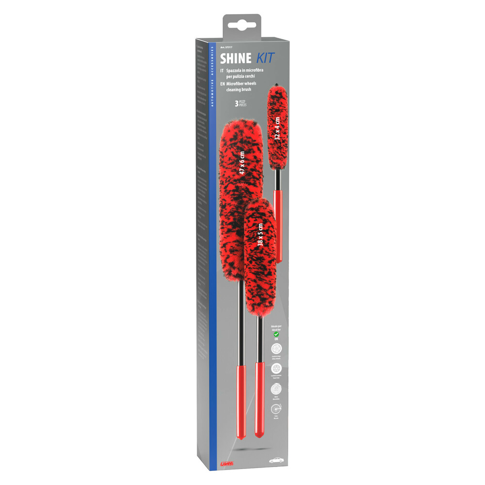 ΒΟΥΡΤΣΕΣ ΠΛΥΣΙΜΑΤΟΣ SHINE ΓΙΑ ΖΑΝΤΕΣ/ΤΑΣΙΑ ΜΙΚΡΟΦΙΜΠΡΑ (S) 32x4cm / (M) 38x5cm / (L) 47x6cm ΣΕΤ LAMPA - 3 ΤΕΜ. Βούρτσες πλυσίματος SHINE, από την εταιρεία LAMPA, ιταλικής προέλευσης. Βούρτσες κατασκευασμένες από στιβαρή αλλά μαλακή αντιχαρακτική μικροΐνα, σχεδιασμένες για τον καθαρισμό ζαντών. Φτάνουν ακόμα και στα πιο δύσκολα μέρη. Ασφαλές για τους τροχούς σας. Ανθεκτικές στις χημικές ουσίες. Λαβή από πολυπροπυλένιο με αντιολισθητική λαβή. Συσκευασία 3 τεμαχίων