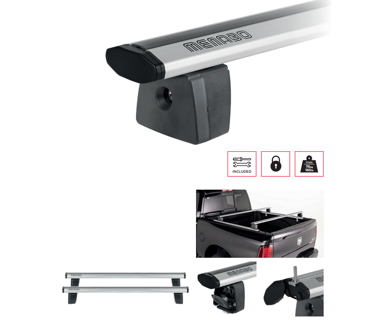 Προ συναρμολογημένες μπάρες καρότσας TRUCK BED RACK SYSTEM (TBR) από τον οίκο MENABO, 100% ιταλικής προέλευσης, σχεδιασμού και κατασκευής από υψηλής ποιότητας ανοδιωμένο αλουμίνιο σε ασημί χρώμα με μαύρες λεπτομέρειες. Πρόκειται για ένα ενισχυμένο υλικό κατασκευής με ένα πρόσθετο λεπτό στρώμα οξείδωσης αλουμινίου, ενσωματωμένο πλήρως στην εξωτερική επιφάνεια της μπάρας, που αναδεικνύει την μεταλλική φύση του προϊόντος και προσφέρει σταθερότητα στο χρώμα, ανθεκτικότητα στην διάρκεια του χρόνου και την έκθεση σε εξωτερικές καιρικές συνθήκες, καθώς και ευκολία συντήρησης. Οι μπάρες TBR είναι συμβατές με οχήματα: