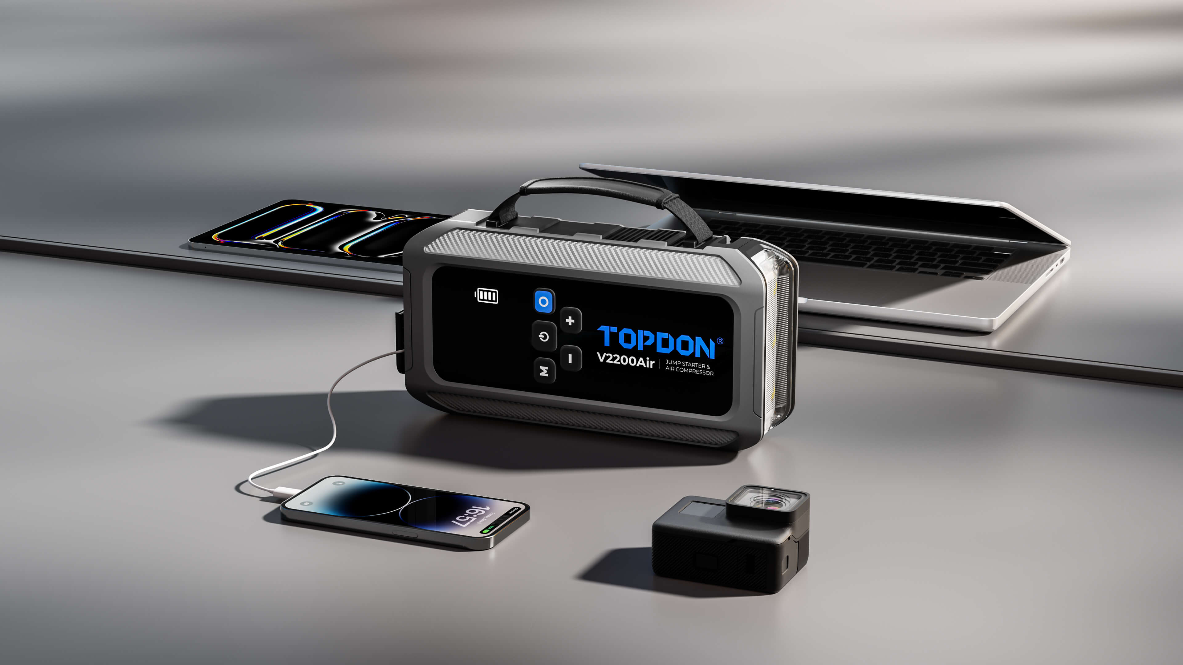Παρουσιάζουμε το V2200Air, την απόλυτη λύση all-in-one για τις έκτακτες ανάγκες κάθε ιδιοκτήτη αυτοκινήτου. Αυτή η ευέλικτη συσκευή σάς επιτρέπει να εκκινήσετε το αυτοκίνητό σας, να φουσκώσετε τα ελαστικά σας, να φορτίσετε τις συσκευές σας και να φωτίσετε το περιβάλλον σας με ευκολία. Μείνετε προετοιμασμένοι για οποιαδήποτε κατάσταση και οδηγήστε με σιγουριά, γνωρίζοντας ότι το V2200Air σας καλύπτει.