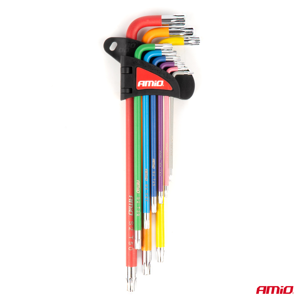 ΣΕΤ ΚΛΕΙΔΙΑ TORX ΑΤΣΑΛΙ S2 ΔΙΑΦΟΡΑ ΜΕΓΕΘΗ ΔΙΑΦΟΡΑ ΧΡΩΜΑΤΑ XL ΑΜΙΟ - 9 ΤΕΜ. Κλειδιά TORX από την εταιρεία ΑΜΙΟ, πολωνικής προέλευσης. Extra Long Design: Η αυξημένη εμβέλεια. Χάλυβας S2: Υλικό υψηλής ποιότητας που εγγυάται εξαιρετική αντοχή, αντοχή στη φθορά και μεγάλη διάρκεια ζωής του εργαλείου. Περιλαμβάνονται 9 κλειδιά: Το σετ περιλαμβάνει τα πιο συχνά χρησιμοποιούμενα μεγέθη TORX, καθιστώντας το ευέλικτο και ιδανικό για μια ποικιλία εργασιών. Ακριβής προσαρμογή: Τέλεια εφαρμογή για βίδες TORX, εξασφαλίζοντας ασφαλές κράτημα και ελαχιστοποιώντας τον κίνδυνο ζημιάς του σπειρώματος. Εργονομικός σχεδιασμός: Γαλλικά κλειδιά σχεδιασμένα για άνεση στη χρήση. Συσκευασία 9 τεμαχίων