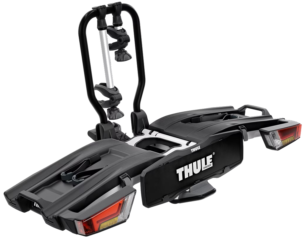Easy mounting of bikes through detachable bike arms with Thule AcuTight torque limiter knobs that click when optimal torque is reached. Bike arms are lockable but will not constitute a total guarantee against bike theft
